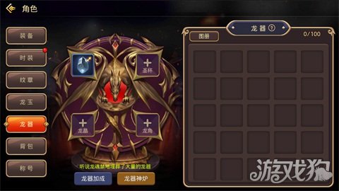 龙器,玩家在游戏过程中随着等级的开放逐步解锁和开放的新的能够增强实力的方式,其具体分为四种品类,即龙晶、龙角、神石以及圣杯,每一种可为玩家带来不同的属性或者效果能力,例如攻击或者辅助等。