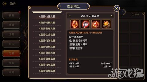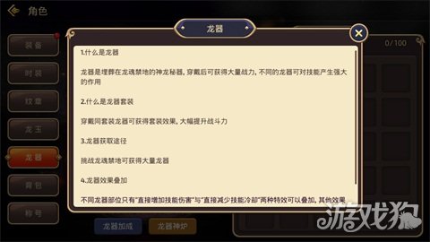 龙器,总共分为四种,即神石、圣杯、龙晶、龙角,每一种有着不同的效果加成能力,在搭配并使用后能够使得玩家在整体的能力上得到跨越式的增长。并且,由于龙器有着不同的等级,而等级越高对于玩家的作用越大,因此在游戏的发展进程中建议玩家搭配越高等级越好。